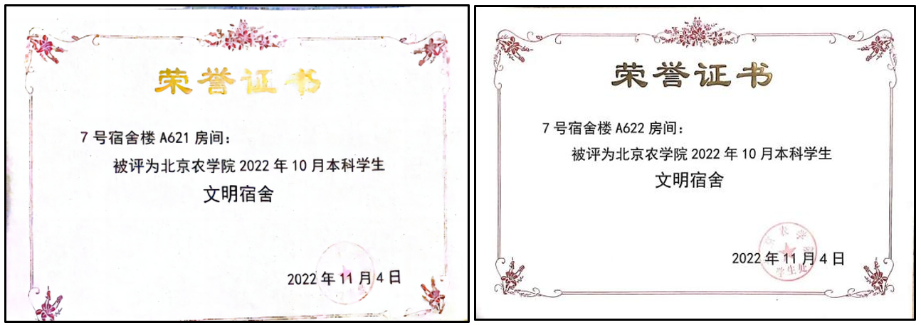 班级同学遵守校规校纪,具有良好的道德品质。在宿舍建设方面,成绩显著,班内无脏、乱、差宿舍,宿舍成绩优秀率达到了百分之百,累计获得7次文明宿舍。其中,7A622宿舍曾4次被评为44118太阳成城本科学生文明宿舍。