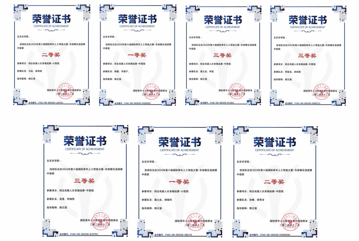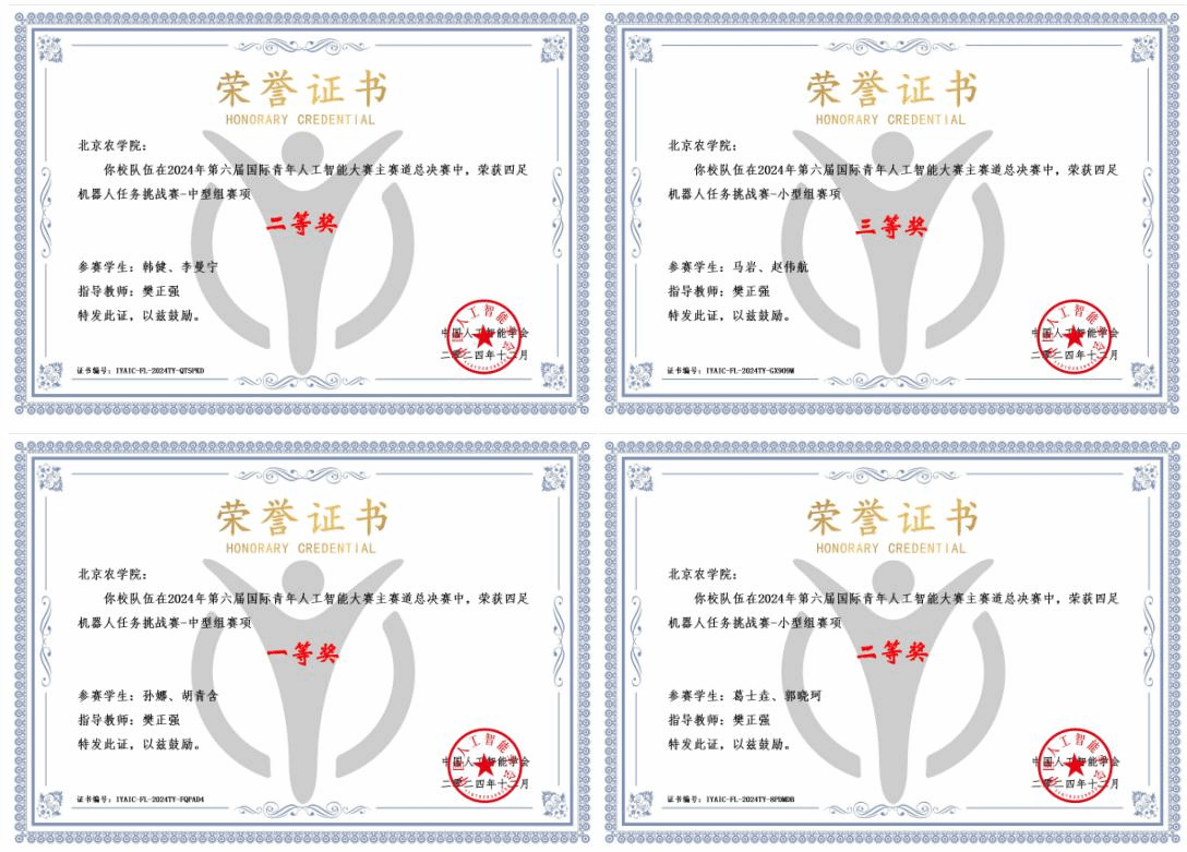近日,第六届国际青年人工智能大赛总决赛在雄安新区盛大举行并圆满落幕。我院学子首次参加该项赛事,赛事过程中,大家团结协作,奋力拼搏,在区域选拔赛(省赛)和总决赛(国赛)中获奖多项。智能学院樊正强老师带队的参赛团队以卓越的表现荣获四足机器人任务挑战赛(中、小型竞赛组)区域选拔赛(省赛)奖项7项,其中一等奖2项、二等奖2项、三等奖3项;荣获总决赛(国赛)奖项4项,其中一等奖1项、二等奖2项、三等奖1项。