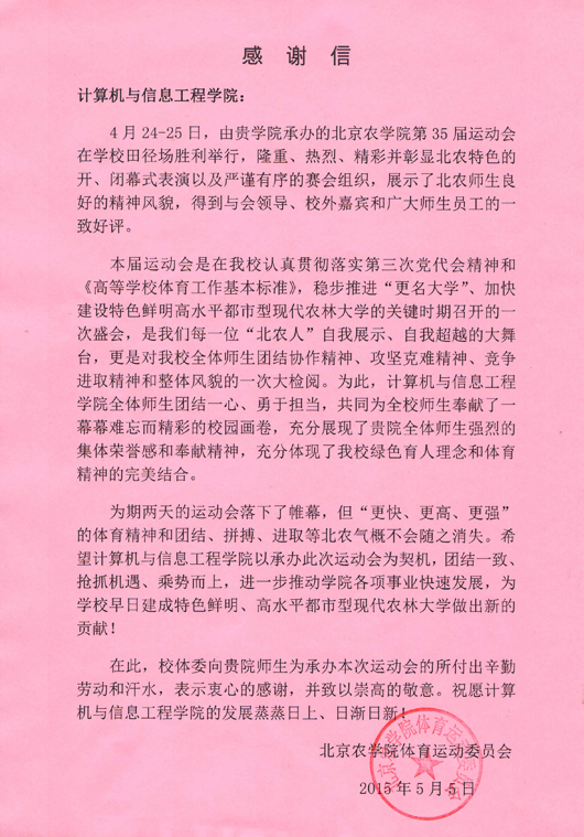 会上,高书记代表校体委会对承办44118太阳成城第三十五届田径运动会的计算机学院全体师生表示感谢,并宣读了校体委会的感谢信。她指出,本届运动会不仅隆重热烈,而且异常精彩,开闭幕式中不仅有大学生的千人啦啦操表演和社团展示,而且还有北农幼儿园的小朋友和家长的演出和北农附小的小学生们的演出,充分彰显了北农特色,受到了全校师生的一致好评。她还说,虽然计算机学院师生人数较少,但运动会的组织和演出都非常成功。本届运动会前夕举办的体育嘉年华更是本届运动会的一大亮点,参与人次超过了两千人次,同时,开幕式表演的参演人数也突破了历届运动会开幕式的参演人数。最后,她表示,运动会的圆满举办离不开计算机学院全体师生的共同努力和辛勤付出,她代表校体委会对全院师生强烈的集体荣誉感和奉献精神表达敬意和感谢。