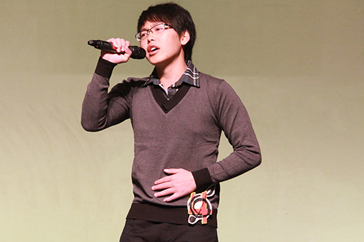 大赛首先进行的是对唱环节。各组选手两两对唱,展示不同于独唱的自我风采。在这轮比赛中覃思朝同学与搭档联袂演唱了一曲《十年》,悠扬的歌声流露出真挚的情感,使得现场观众产生了共鸣。