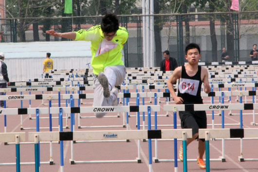 在下午的13:30分的男子110米栏决赛中,计算机学院刘永强同学取得了第三名的优异成绩,在采访中,他表示,对于跨栏比赛,因为没有参加过专业训练,所以赛前对赛道上的10个栏感到很恐惧,自己在课下也特意小心地练习过,在比赛时抛开杂念,只看着前方的栏和不远处的终点,顺利到达终点。