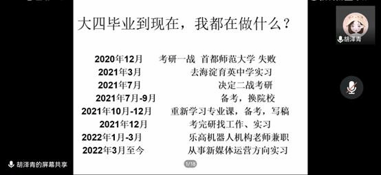 辅导员宁宁从当前就业形势、具体就业政策、求职渠道和就业流程、就业关键词详解等方面为毕业生和老师进行了详细的讲解。学院2021届毕业生胡泽青、张雄两位同学结合毕业一年来的个人成长情况,与毕业生分享了自己的求学、求职经历。