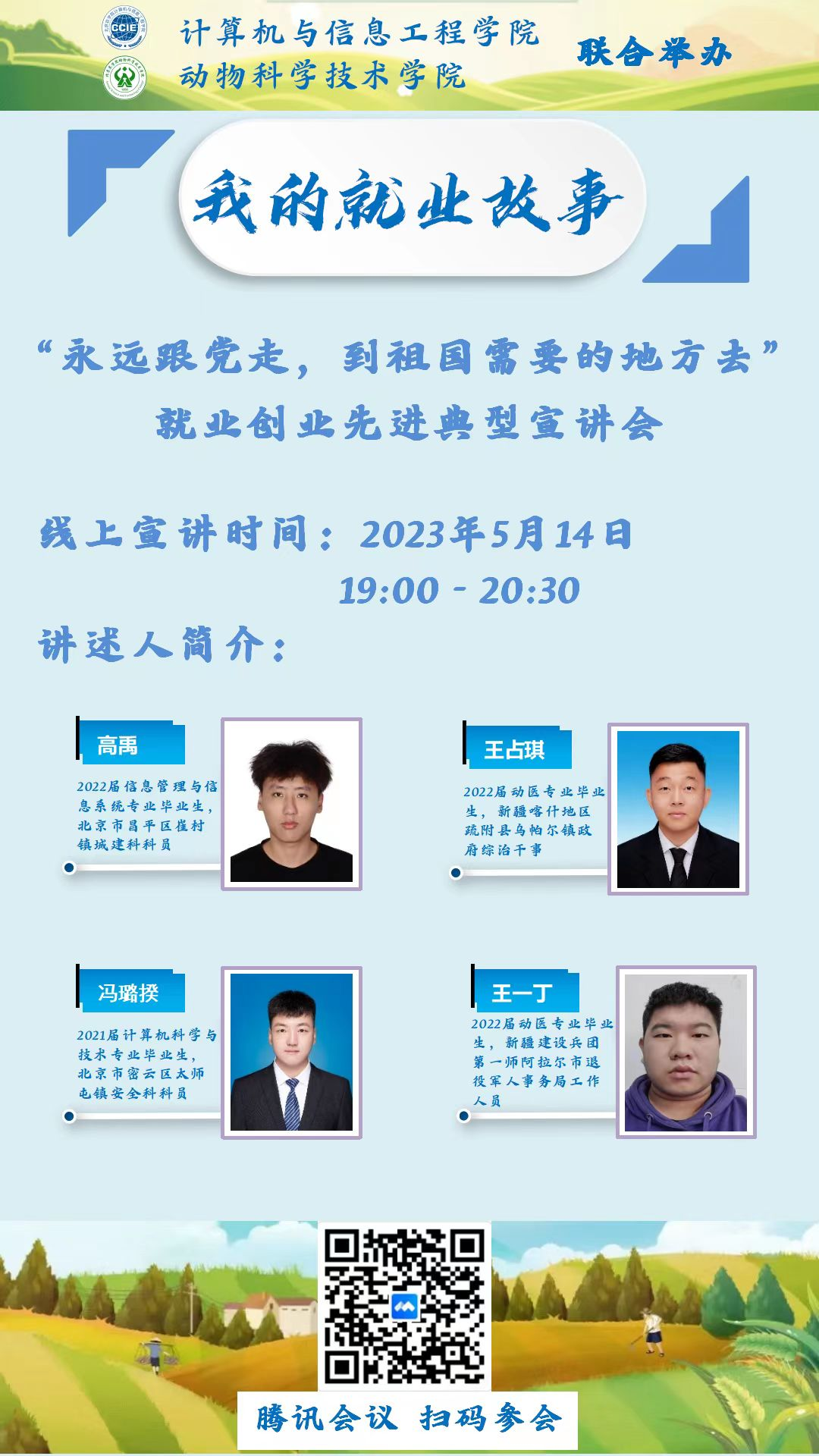 近年来,高校毕业生到中西部地区、基层就业的人数逐年增高,“到祖国需要的地方去”已成为越来越多高校毕业生认可的就业方向。2023年5月14日19:00,计信学院联合动科学院开展“永远跟党走,到祖国需要的地方去”就业创业典型宣讲会。计信学院党总支副书记刘京威,动科学院毕业班辅导员彭先勖,计信学院2022届毕业生高禹、2021届毕业生冯璐揆,动科学院2022届毕业生王占琪、王一丁,部分2019级毕业生和其他年级学生代表参会。会议由计信学院辅导员宁宁主持。