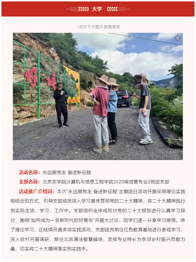 支部组织全体成员认真学习二十大报告中的主要内容并围绕如何成为一名新时代的好青年开展热烈讨论,同学们逐一分享学习感悟和心得体会。同学们纷纷表示:“作为一名共青团员,在日常学习、生活、工作中,就要勇于吃苦、争当先锋。要勇担责任,迎难而上,做新时代好青年。”为了加深同学们的认识,提高大家的学习积极性,支部开展了二十大精神问答活动,让同学们在愉快的氛围中加深对二十大精神的学习和了解。为了让二十大精神的学习落细落实,支部组织全体成员以学习贯彻二十大精神为主题,利用暑期深入开展社会实践活动,参与率100%。支部组织学生分别前往红色教育基地进行参观学习、深入农村开展调研、前往北农蒲洼智慧蜂场,发挥专业特长为京郊乡村振兴贡献力量,引导同学们切实将二十大精神落实到实践中。