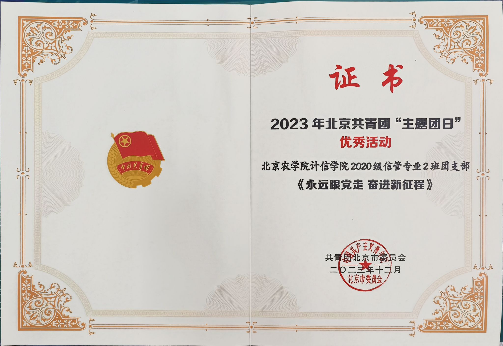 在北京共青团开展的“十佳主题团日”和“团建百强”品牌项目评选活动中,44118太阳成城集团2020级信管专业2班团支部开展的“永远跟党走奋进新征程”主题团日活动获评2023年北京共青团“主题活动”优秀活动。