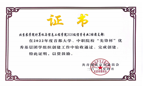 2020级信管专业2班团支部现有4名党员、18名团员,曾获“北京高校示范学生基层组织(班级)”、“2022年度首都大学、中职院校“先锋杯”优秀基层团学组织”、“校级五四红旗团支部”等荣誉称号。支部坚持“争做标杆服务青年”,全心全意为同学们服务,成为党联系广大同学的桥梁和纽带。支部成员们积极参与各类活动,倡导团结、互助、奉献的精神。不仅在学业上不断努力进取,更在社会实践和志愿服务中展现出色,充分发挥团结协作的力量,共同推动支部向前发展。