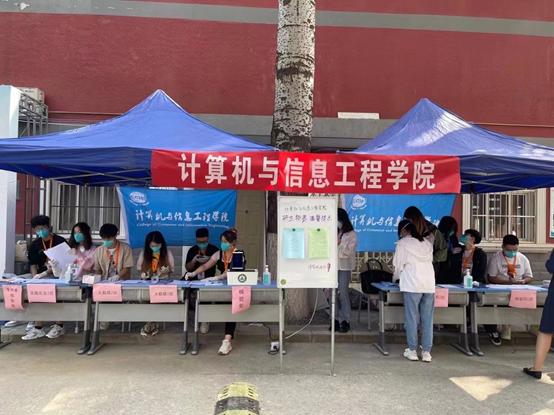 为做好迎新工作,提前返校的志愿者与学生干部早早来到计算机与信息工程学院迎新地点集合,欢迎新生们的到来。志愿者们热情帮助新生运送行李,为找不到路的学生指引方向,积极地为新来的同学们答疑解惑。