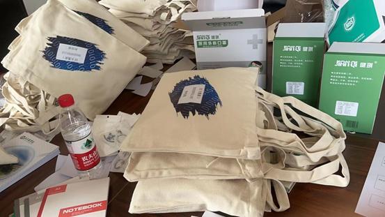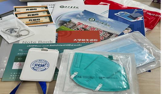 学院为每一名新生准备了一个入学礼包,里面包含新生文化衫、卡套、校园卡、钥匙扣、新生适应与成长攻略、新生效率手册、医用口罩一包、N95口罩一个、3日餐盒券和笔记本等“新生10件套”,统一装入学院自主设计的帆布袋中。